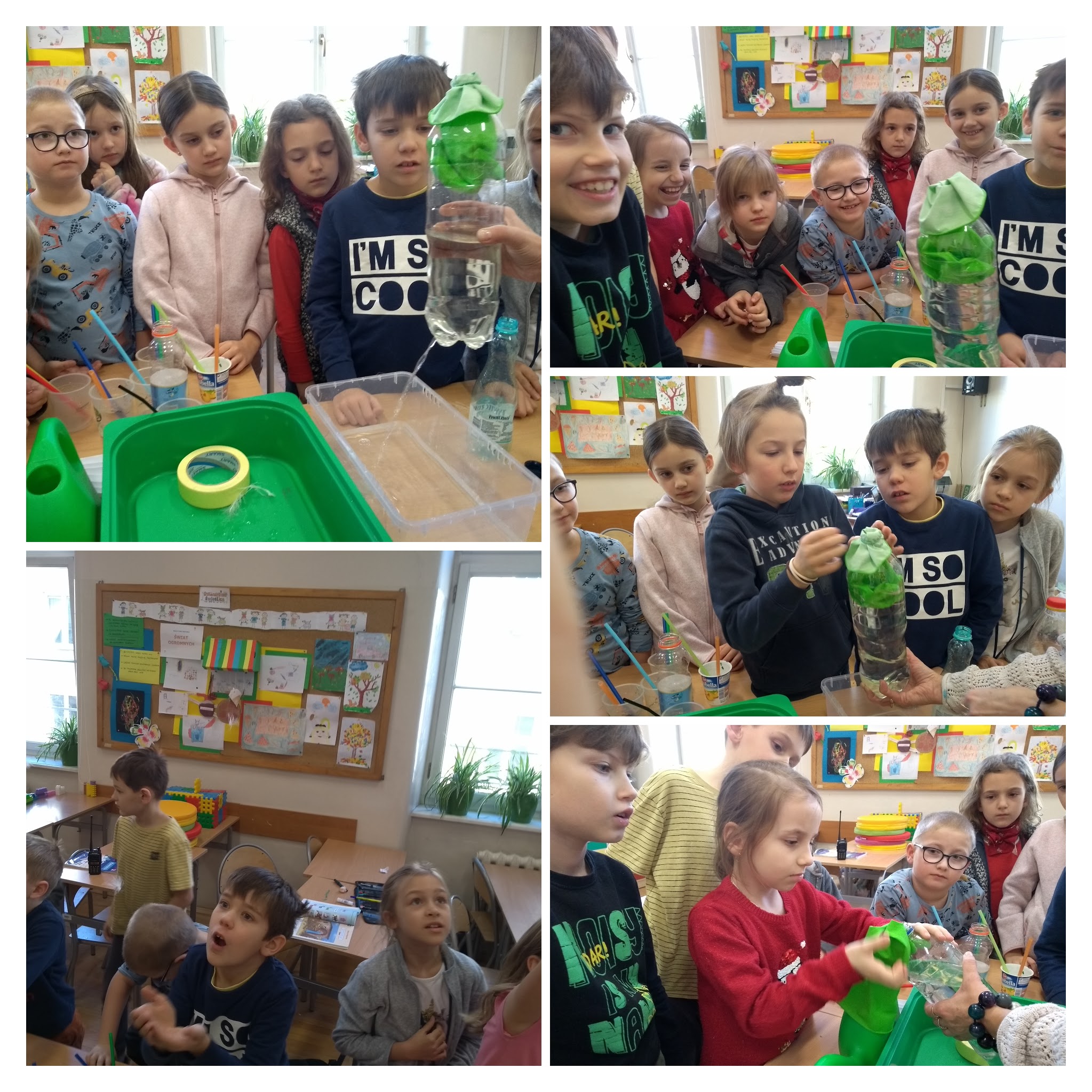 Tak poznawaliśmy właściwości powietrza. W butelce jest gumowa rękawiczka - w czasie naszego doświadczenia "sama" napełniła się powietrzem.