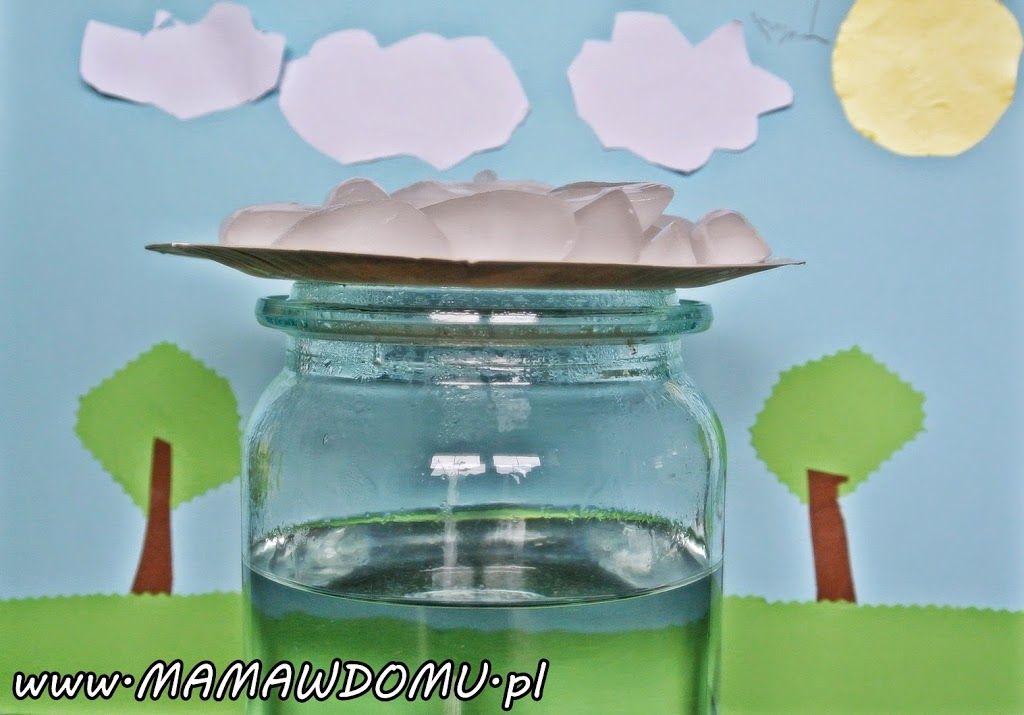 Na słoik z wodą nałóżcie talerz z kostkami lodu i obserwujcie co się będzie działo na ściankach szklanego pojemnika. A przy okazji koniecznie porozmawiajcie o deszczu i trzech stanach skupienia wody!